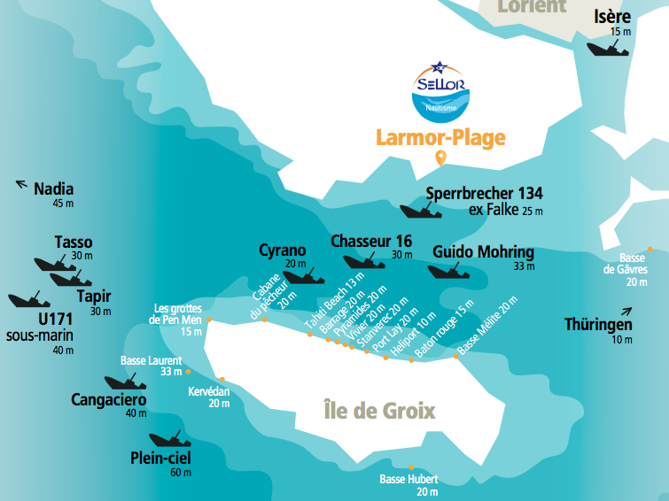 Larmor-Plage est située juste en face de l'île de Groix. Elle offre plus de 40 spots de plongées aux profondeurs variées. Les plongées se feront à partir du Centre Nautique de Kerguelen.